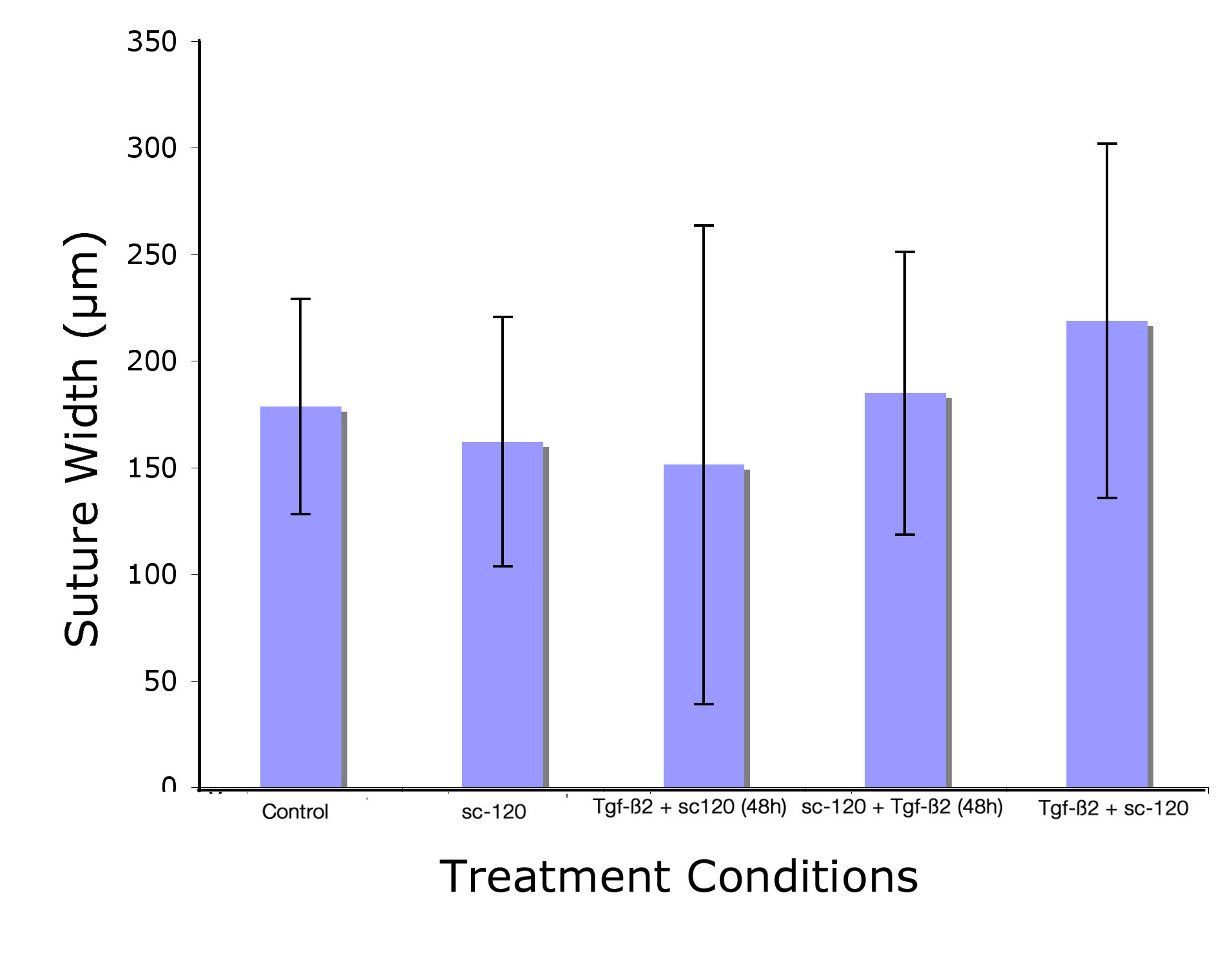J. KAYNE1, J.T. RAWLINS2, C.R. FERNANDEZ1, and L.A. OPPERMAN1, 1Texas A&M Health Science Center, Baylor College of Dentistry, Dallas, USA, 2Ohio State University, Columbus, USA | Objective: Tgf-ß2 induces Egf expression prior to induction of suture fusion. However, Egf alone does not induce suture closure. Pretreatment of calvariae with Egf blocks Tgf-ß2-induced suture closure, whereas post treatment has no effect on Tgf-ß2-induced suture closure. This study was done to test if Egf receptor signaling modulates Tgf-ß2 activity in sutures. Methods: Twenty E17.5 mice were sacrificed, their calveriae dissected and cultured for 5 days in 1) serum free medium (SFM) alone, 2) SFM plus 50mM sc-120 (sc-120), 3) SFM and 3 ng/ml Tgf-ß2 (Tgf-ß2), with sc-120 added at 48 hours, 4) SFM and sc-120, with Tgf-ß2 added at 48 hours, and 5) SFM with sc-120 and Tgf-ß2 with n=4 per group. Tissues were then harvested and prepared for histological sectioning of coronal sutures and H&E staining. Sutures were viewed under a microscope and the shortest distances between bone fronts across the suture were measured using Metamorph®. Data was stored in an Excel file and averages and standard deviations calculated within each group and between the groups. Results: No significant differences in suture width were found within or between the groups, demonstrating that blocking Egf receptor activity either before or after Tgf-ß2 treatment blocked Tgf-ß2-induced suture closure. Conclusion: Since Egf alone does not induce suture closure, it was not unexpected that sc-120 alone had no effect on suture width. That blocking Egf activity after Tgf-ß2 treatment abrogates suture obliteration indicates Tgf-ß2 requires Egf signaling to induce suture closure. An unexpected finding was that blocking Egf receptor activity prior to Tgf-ß2 treatment also blocked Tgf-ß2 induced suture closure. However, since sc-120 was present for the duration of culture, it is likely that the presence of sc-120 after Tgf-ß2 treatment was responsible for blocking the Tgf-ß2 effect on sutures.